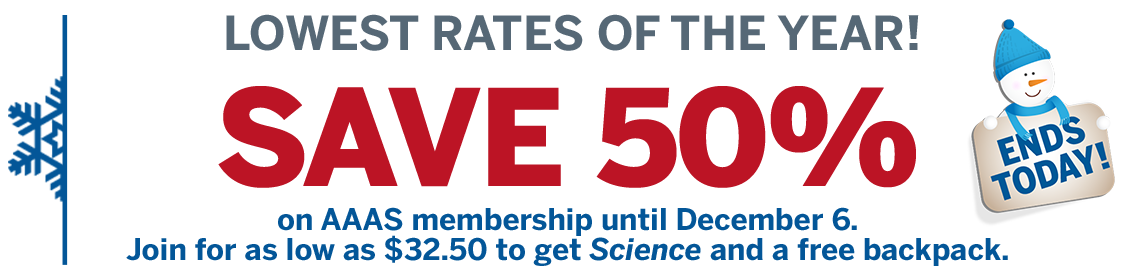 Discount plus backpack offer valid from Nov. 25, 2016 to Dec. 6, 2016 while supplies last, for new individual members only. There is a limit of one backpack per membership order. Please allow 2-4 weeks for delivery. The AAAS backpack is provided as is without any guarantees or warranty. In association with the product, AAAS makes no warranties of any kind, either express or implied, including but not limited to warranties of merchantability or fitness for a particular purpose. Use of the product is at the user’s risk.